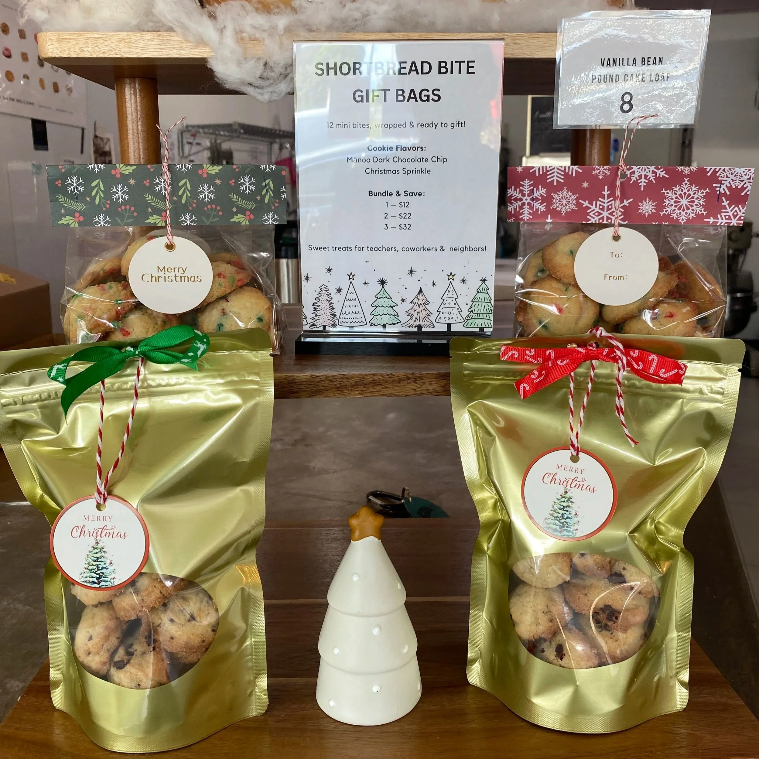 Our signature shortbread baked into bite-size pieces! Perfect for gift-giving (neighbors, teacher, co-worker, etc)! Each bag included one dozen bite size cookies.